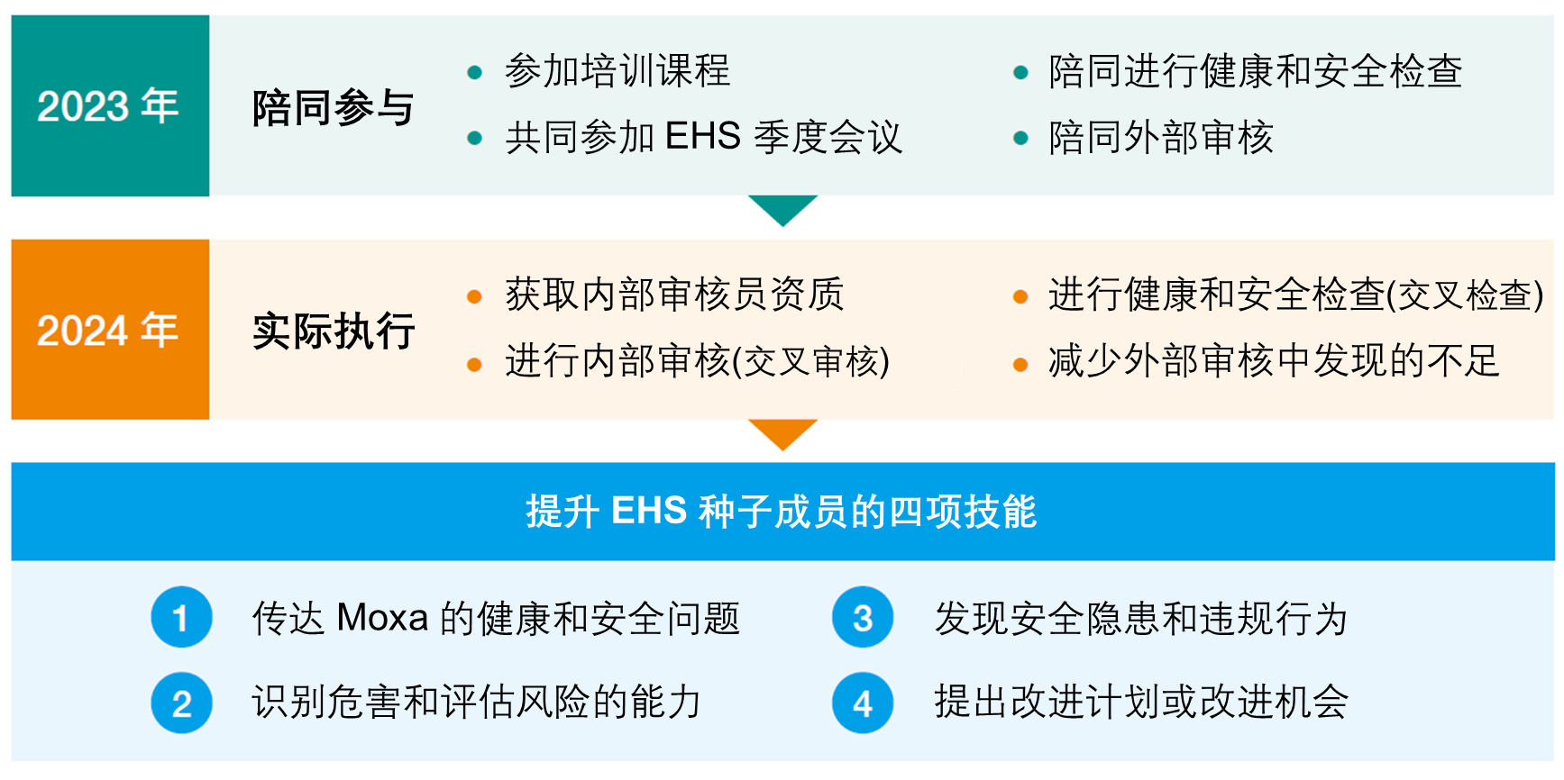 EHS 种子成员负责传递安全意识,提醒员工重要事项。2024 年,Moxa 安排 EHS 种子成员及相关人员(共 40 人)获得“EHS 管理体系 —— 内部审核员”资质。此外,EHS 种子成员的工作重点从“陪同参与”转变为“实际执行”。他们能够实际参与跨部门健康与安全检查和审核,分享优秀实践经验,学习新知识,改进本部门的不足,进一步强化各部门的安全健康意识,建立统一的安全标准,共同推动 Moxa 的安全文化建设,有效降低潜在风险,提高整体安全意识。