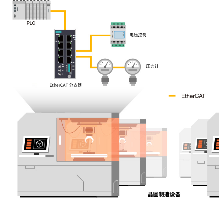 在半导体制造业中,EtherCAT 协议正成为主流技术。以等离子体增强化学气相沉积 (PECVD) 设备为例,在空间受限且嘈杂的环境中新增设备往往颇具挑战性。新设备还需与多个传感器、压力表和电力控制装置连接。因此,设备制造商需采用抗干扰性能优越且兼顾未来扩展能力的多端口紧凑型 EtherCAT 产品。