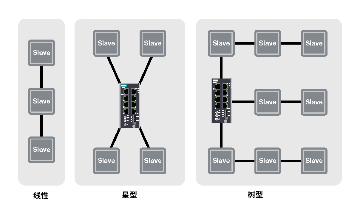 那么,如何才能突破最简单却最脆弱的拓扑结构限制,充分发挥 EtherCAT 技术优势?答案在于——采用不同的拓扑结构来构建更具韧性的网络架构。EtherCAT 技术支持多种拓扑结构,包括树型和星型。下文将探讨这些拓扑结构如何助力构建更稳固的 EtherCAT 网络。