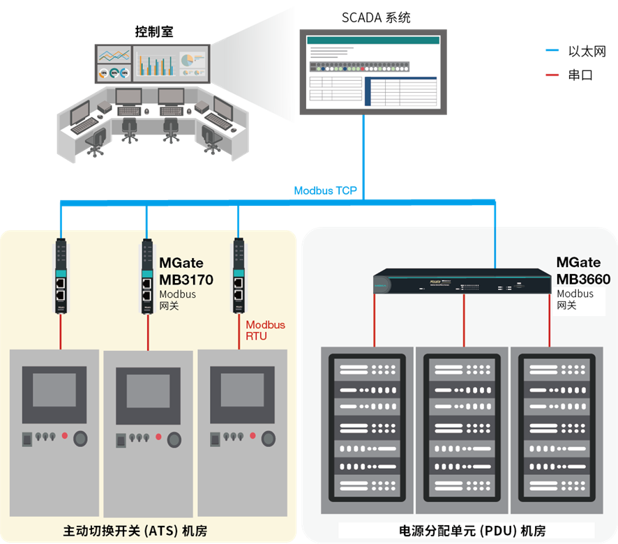 为了监测用电情况和电能质量,电源供应设备(包括开关设备、PDU 和 UPS)需要联网,以便运维人员接收实时信息。Moxa MGate MB3000 协议网关在基于串口的 Modbus RTU 传输模式设备(如在电源供应设备内安装的电表)与控制中心基于以太网的 SCADA 系统之间建立通信网桥。当公司 IT 人员需要进行漏洞扫描时,他们必须扫描数千个 MGate MB3000 协议网关,一旦发现漏洞,就能立即采取行动。