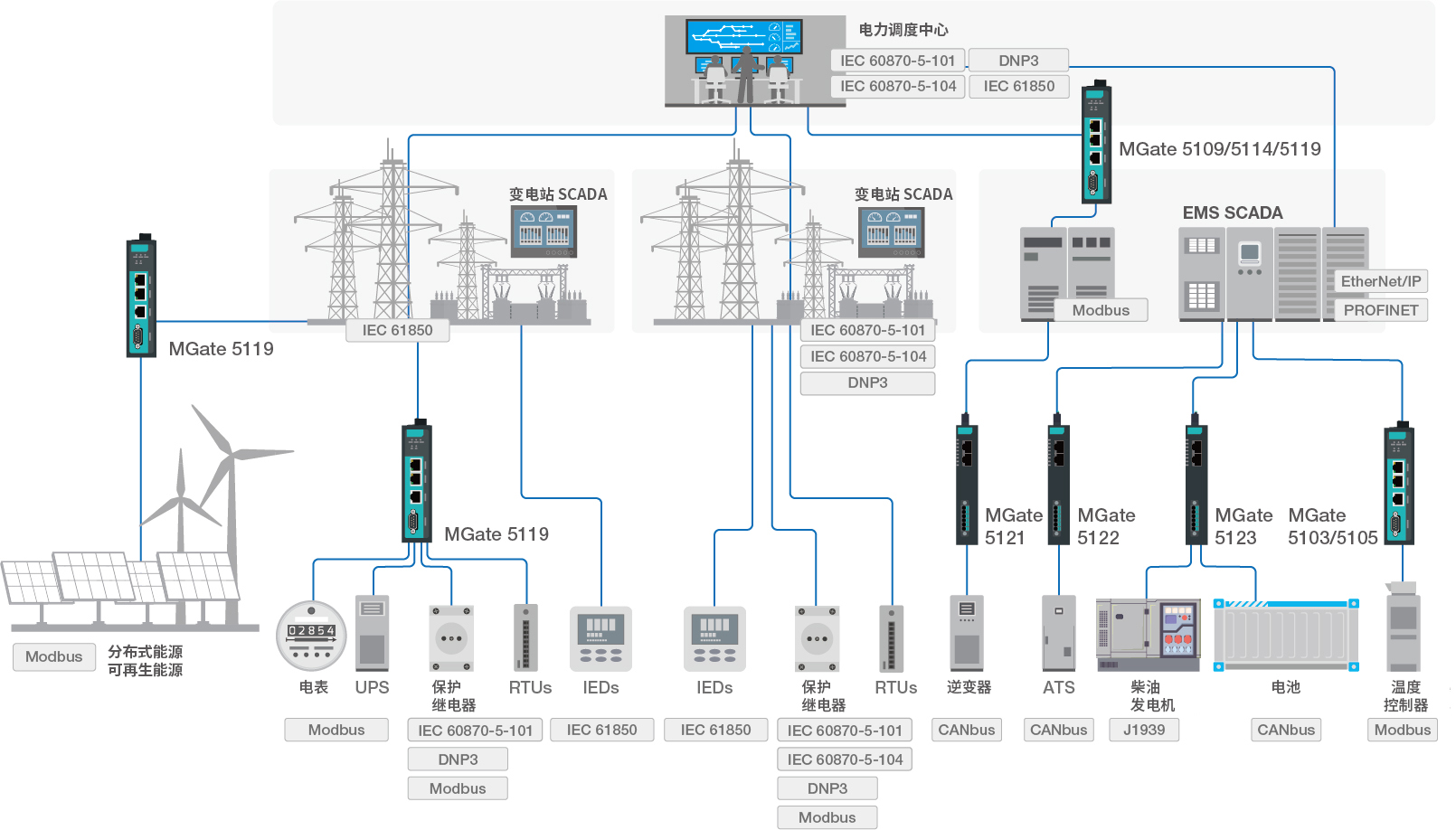 智能电网规模庞大,由多个子系统组成,涵盖传统发电、可再生能源、数字变电站、电网、储能系统、终端用户。各子系统都有其特点及要求,包括配电控制、电力监控、储能管理等。这些子系统使用的通信协议各不相同,给智能电网的平稳运行带来挑战。例如,馈线通常使用 IEC 61850、DNP3 或 IEC 101/104 协议,电表使用 Modbus 协议,可再生能源系统多为 CANbus 协议,备用电源则是 J1939 协议。因此,统一收集并处理子系统的所有数据是一项极为复杂的工作。