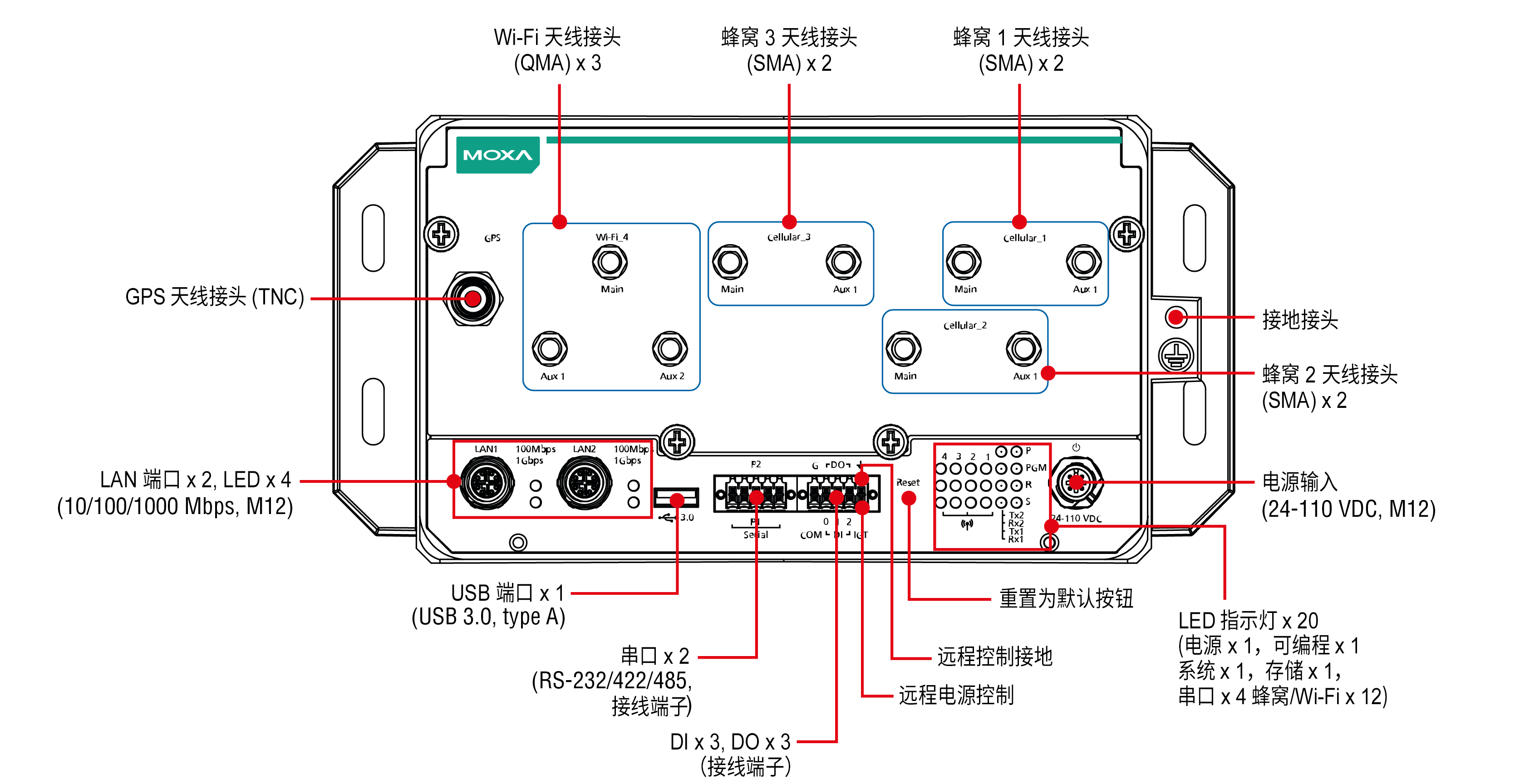 UC-8580 提供两种不同种类的天线接头可选。SMA 型号支持所有类型的 SMA 接头。QMA 型号支持用于 GPS 的 TNC 接头和用于 Wi-Fi/蜂窝模块的 QMA 接头,并配备 4 个用于安装无线模块的插槽。 无线模块单独出售。获取详细信息,请联系 Moxa 销售代表。 其中 3 个插槽支持 4G LTE 模块,1 个插槽支持 Wi-Fi 模块。每个 4G/LTE 模块均配备 2 个 SIM 卡插槽,并可利用内置的 MIRF 2.0(Moxa 设备远程管理平台,可支持无线管理),来实现冗余蜂窝网络通信或选择 SIM 卡的地理围栏。
