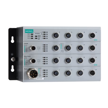 Managed Ethernet switch with 12 10/100BaseT(X) ports, and 4 10/100/1000BaseT(X) ports with M12 connectors, 4 Gigabit Ethernet ports with bypass relay function support, dual redundant power inputs (24-110 VDC), -40 to 75°C operating temperature, conformal coating model