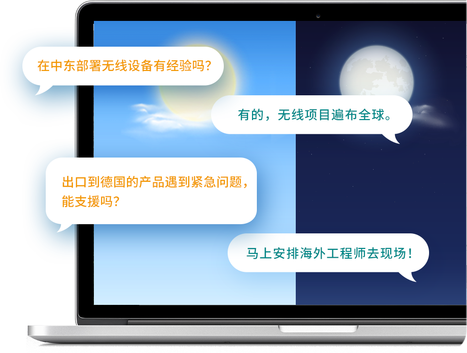 无线技术专家不止于提供专业的产品配置, 还拥有丰富的本地化无线通信部署经验, 以及与第三方品牌无缝集成的专业知识。借助全球服务网络, 我们不仅提供远程支持, 更能现场及时响应, 最大限度减少时差和语言隔阂对出海项目的时效性影响。